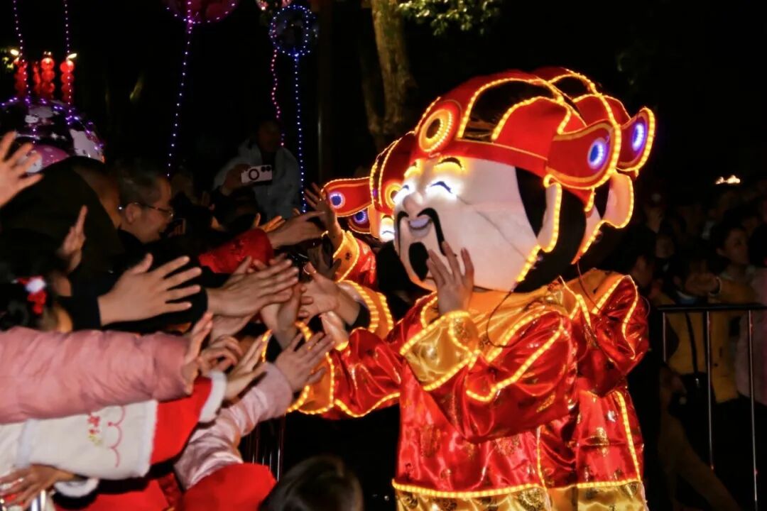 巡游队伍中,发光财神方阵最为吸睛。憨态可掬的财神人偶身着缀满LED灯带的红金华服,在夜色中流光溢