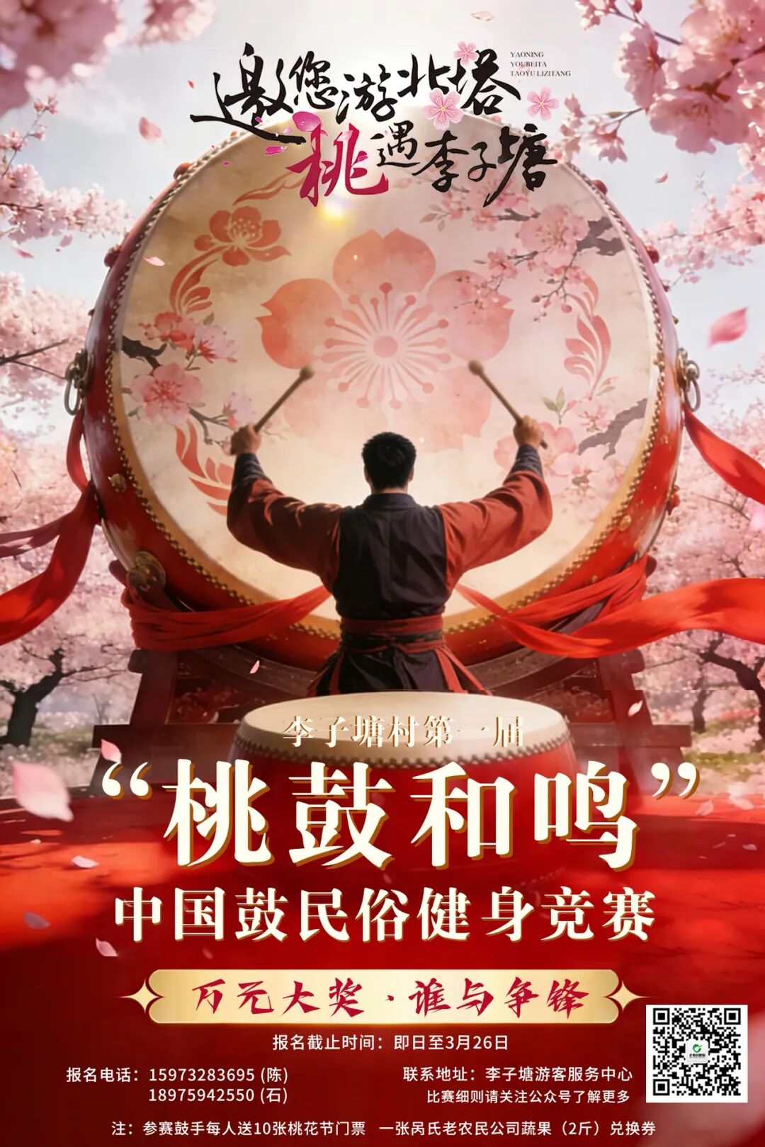 李子塘桃花节 春日赴约,桃韵北塔!第三届李子塘桃花节重磅启幕,同步开启“桃鼓和鸣”鼓王争霸赛召集令,以花为媒、以鼓会友,共赴一场春日视听盛宴! •活动名称:北塔区李子塘第三届桃花节暨“桃鼓和鸣”鼓王争霸赛 •活动时间:3月28日-29日 •活动地点:北塔区李子塘村北塔区李子塘村黄桃产业园 鼓王争霸赛万元大奖等你赢 •报名时间:即日起至3月26日 报名方式: 陈:15973283695 石:18975942550 •报名地址:李子塘游客服务中心 奖项设置(各1名): 一等奖:10000元 二等奖:6000元 三等奖:3000元 主办单位:湖南呙氏老农民生态农业股份有限公司 •参赛福利:每位参赛鼓手赠送10张桃花节门票+神秘小礼品 赏花攻略 3月28日,李子塘千亩桃花竞相绽放,粉黛如云、漫山遍野,漫步花间小径,邂逅春日浪漫,拍照打卡、休闲游玩,沉浸式感受乡村春日之美! 门票福利 桃花节门票10元/张,凭门票可在黄桃成熟时兑换黄桃,现场还准备了马家米粉,赏花尝果嗦粉,三重惊喜!